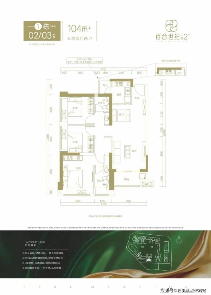 104㎡的3房2厅2卫,1栋02/03户型,设计的是竖厅格局,客厅3.6米开间,LDKB一体化设计,三开间朝南,动静分区,得房率约76%(不含赠送),正南朝向。套内面积79.04㎡+赠送10.31㎡=实得89.35㎡,加上赠送得房率约85.91%。