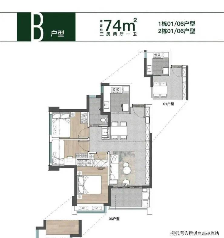 卓越空间设计,打造科学尺寸空间,原万科团队精心雕琢,打造建面约74-77㎡三房住宅。