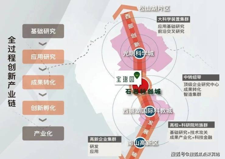 ◎科技中轴贯穿南山科技园、西丽国际科教城、宝安科创城、光明科学城等,宝安科创城位于科技中轴关键节点,定位科技产业成果转化的承载区域。