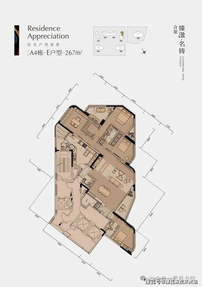约 280 平四房格局非常规格,每个空间独立设计,对开发商的产品打磨能力有一定考验。建面322-403㎡南向大平层、头排江景
