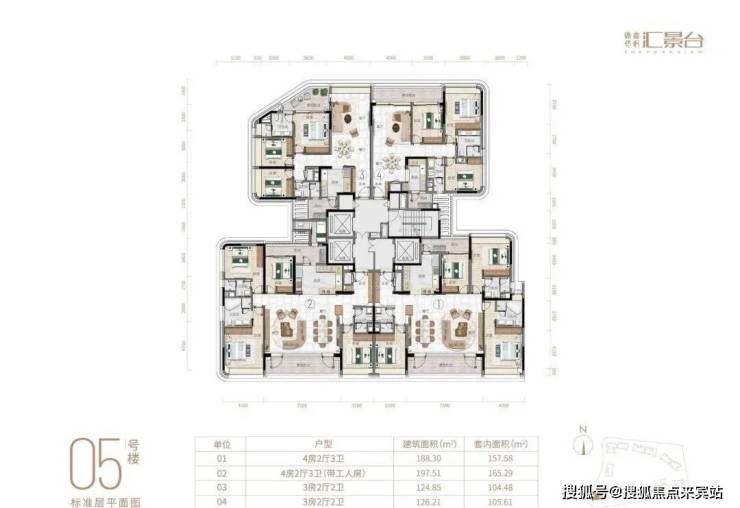 项目由14栋12层小高层组成,产品涵盖123-352㎡三至五房,共8类户型,户型实用率约82-84%