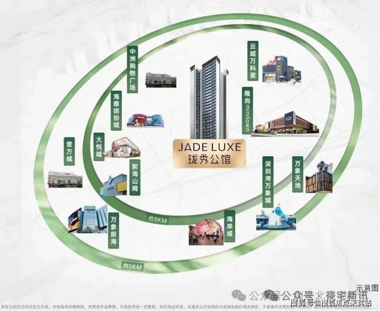 约3-5KM范围内:聚集南山前海山姆、云城万科里、万象前海、万象天地、海岸城、深圳湾万象城等高端及旗舰商业;以及宝中海雅缤纷城、大悦城、中洲购物广场等潮流商业MALL;