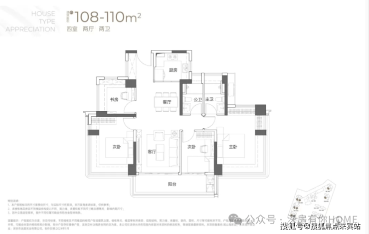 108-110㎡4房2卫户型:为西南向或东南向,竖庭设计,南北通透,阳台也是连通到次卧对出,比较宽敞。