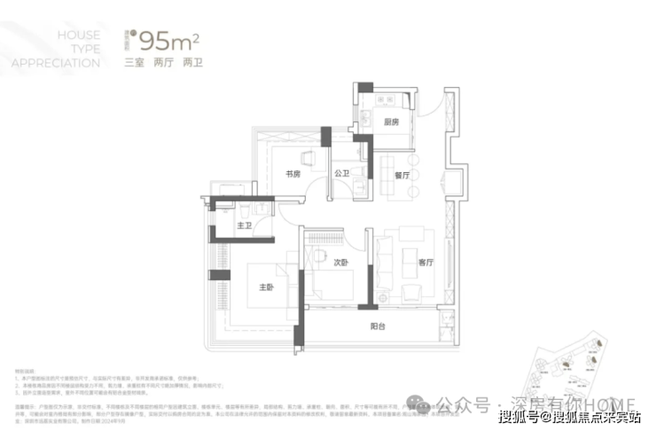 95㎡3房2卫户型:为西南向(部分户型看海)或东北向看山景,是传统的竖庭格局,南北通透。该户型得房率超89%,堪比市面上多数110㎡户型实用面积。