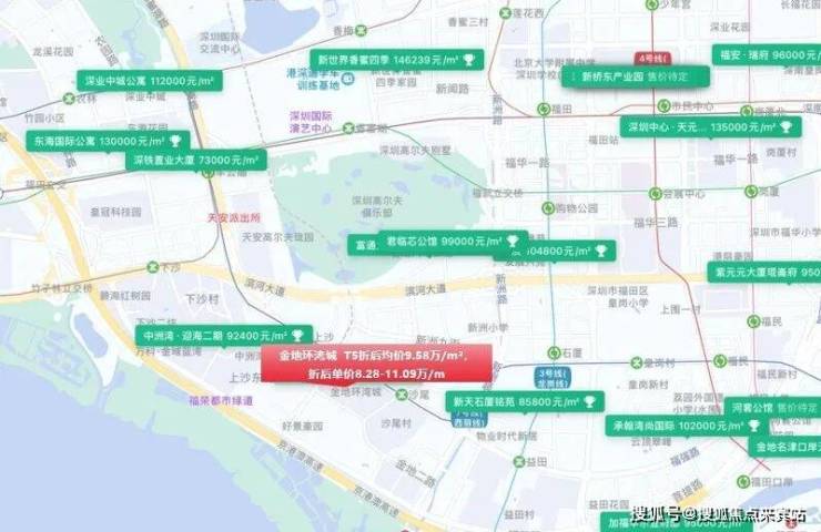 与此同时,项目整体定价在福田核心区同类产品中优势明显,福田核心区基本均价10万+/㎡。而金地环湾城在规模更大、配套更完善的情况下,价格优势明显。