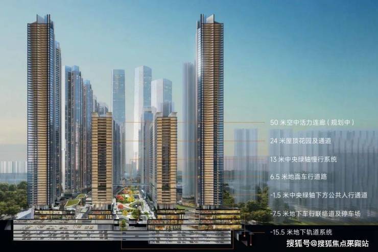 创新打造地上地下七重结构立体化交通系统,不同交通系统分层互联,人行系统、城市公共道路系统、地下轨交系统快速接驳,最大程度实现人车分流,科学化疏解交通压力。