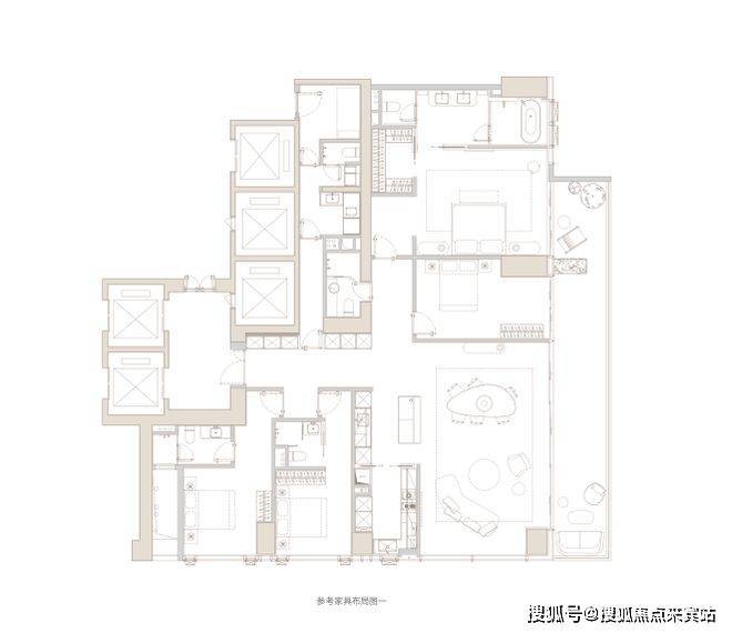 奢丨双套房奢阔合理。主卧-朝东侧海景布置,大面宽落地门窗连接景观阳台,阔绰酒店式套房设计,形成完整私域空间。次卧-尺度合理,灵活布置,与主卧互不干扰。