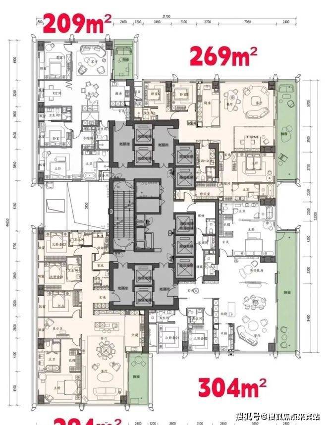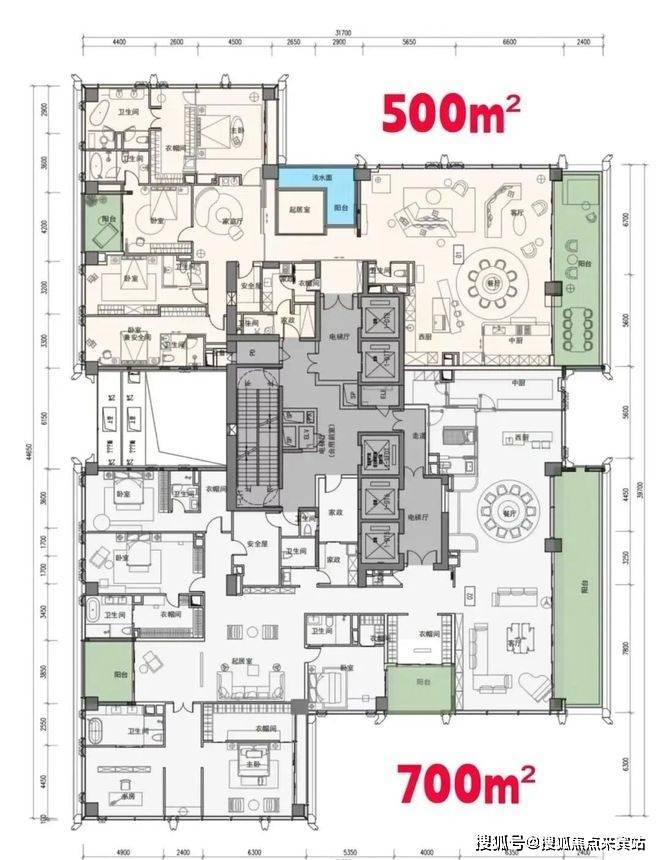 超高区(58层起,200米以上):约500-700㎡顶级大平层。