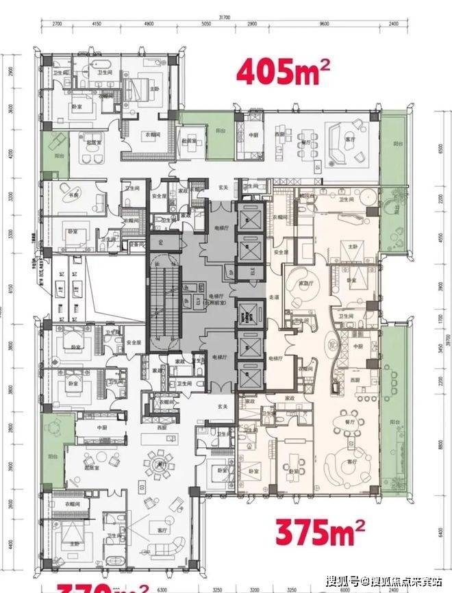 •高区户型(51-65层):405㎡五房两厅五卫旗舰户型,全玻璃幕墙外立面,270°环幕视野,直瞰深圳湾全景与人才公园绿意,私享电梯厅+家政套间+家庭厅豪华配置。
