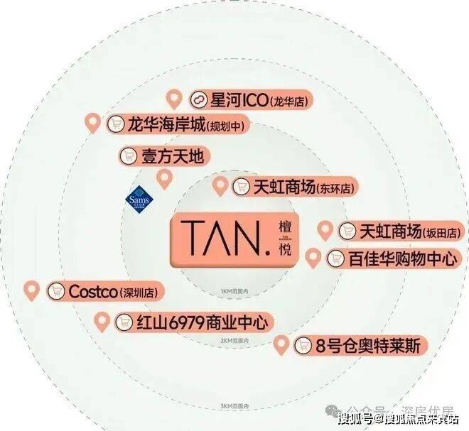 项目自带特色商业街,并且紧邻项目有天虹商场(东环店),距离壹方天地(建面约60万㎡航母级体验式商业集群)约1.5km,周边还有山姆会员店、天虹商场(坂田店)以及Costco会员旗舰店等,一站式满足不同生活需求。