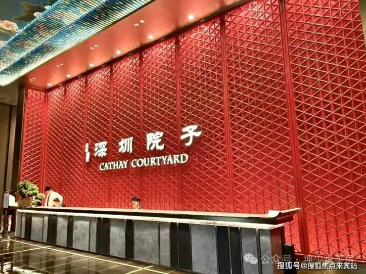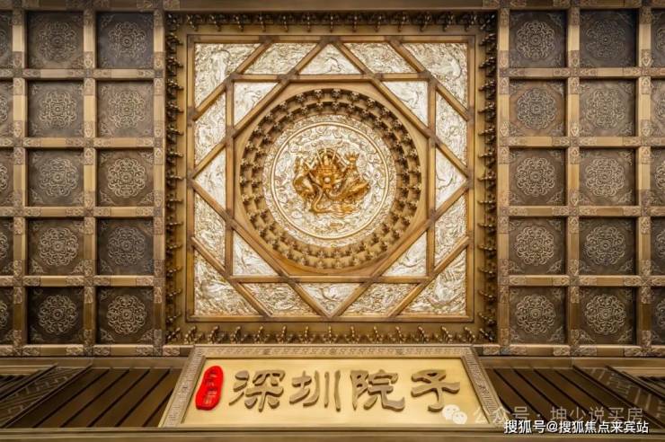 三交六椀菱花勾勒宽屏朱砂红墙上,琉璃黄的“深圳院子”题于墙上,倒映在由御窑金砖铺设的乌黑地面上,其中镶嵌天然玉石,寓意“金镶玉”的实力表达。