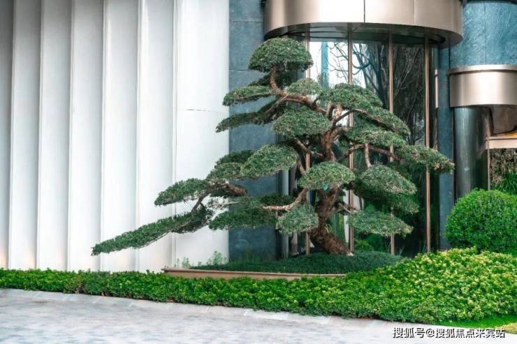 在主入口,首先映入眼帘的是高约3米的罗汉松,身姿挺拔,与两株冬青树一起,带来第一重归家仪式。