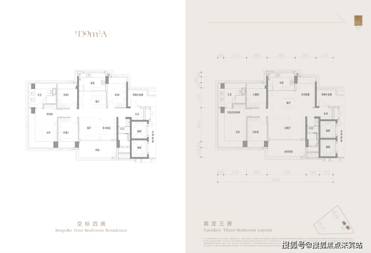首先来看看139㎡A户型,位于3栋的两个东西端头位,2梯3户、3.1米层高,采用竖厅南北通透设计,配备独立入户前室与玄关,主卧搭载270°无柱转角飘窗,作为入门级改善优选,其核心亮点的是可自由切换三房、四房。选三房可让餐厅区域有效扩展,形成阔绰的餐客厅,茶室或多功能区域,选四房可满足多成员居住需求。可选用SCD设计的两种装修风格。需留意,西端户可俯瞰社区公园与双界河东段,东端户以城市景观与园景为主,但需要注意与同层B户型的对视问题,如果非常介意对视问题的朋友可能就不是非常适合该户型了。