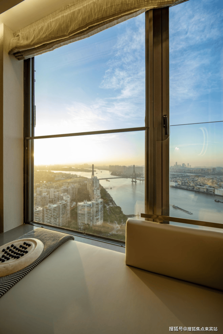 一处阳台就能将珠江两岸尽收眼底,碧蓝的天空,温暖的暮色,轮船拖动的波纹,都变成了一幅风景画。