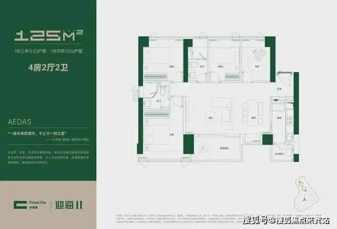 约125㎡4房2厅2卫户型:也是大横厅布局,放大了约109㎡户型的全部优点。端头位置,三面采光,四面宽朝南看海景,约12米观海面宽,海景生活更极致。