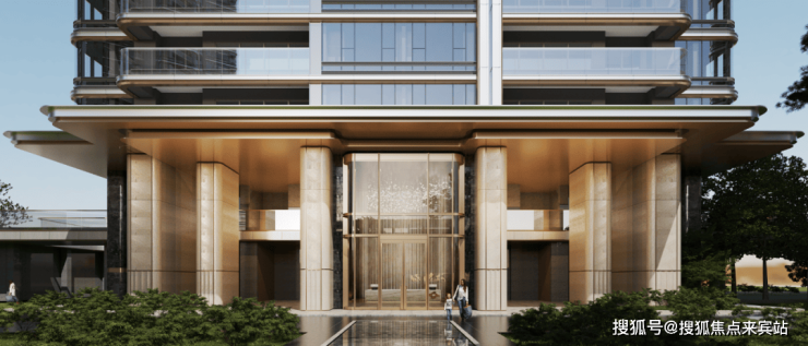 主入口是约55米宽、约8.7米挑高的酒店式大门,再以各种奢石铺陈;