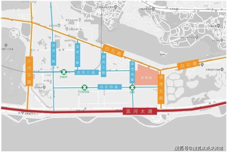 项目交通:本项目东临双向6车道深湾五路、南临双向4车道白石四道,西临双向4车道深湾四路,北临双向6车道白石路,南侧距离深圳的东西主干道—滨河大道约300米;片区有轨道交通9号线、11号线通过:在本地块西南角(深湾四路和白石四道交汇处)设有深湾站;距离地铁11号线红树湾南站约700米。
