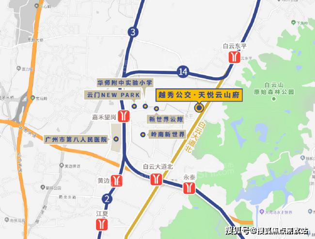 白云嘉禾望岗新房越秀公交天悦云山府位于白云大道北,紧邻岭南新世界,东侧直面白云山,部分户型可享一线山景。项目由越秀地产(广州41年本土房企)和广州公交集团联合开发,主打“公交TOD”模式,即住宅与公交站场无缝衔接,提升出行便利性。