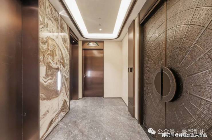 进入入户大堂,奢石的运用更是达到艺术化与功能性的共生。约3.5米宽、7.9米高的潘多拉奢石背景墙,石材天然的棕白纹理如飞龙盘旋而上,色彩随光影流动,赋予静态石材动态艺术感。