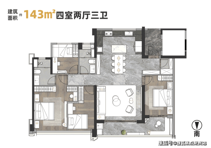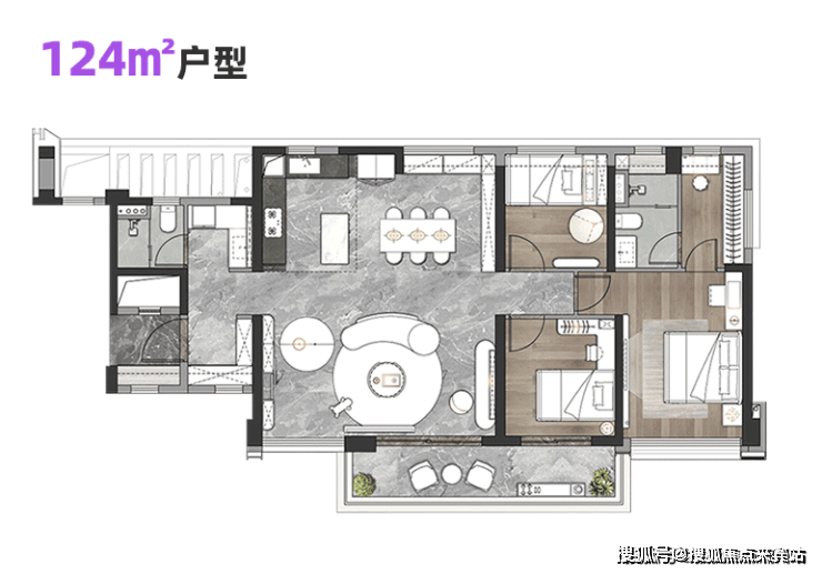 建面约124平户型虽然是整个项目最小的产品,但同样享有私梯入户设计,入门处除了玄关外还有两边储物空间,全南向四开间加上约7米大阳台,景观与通风的极致体验。