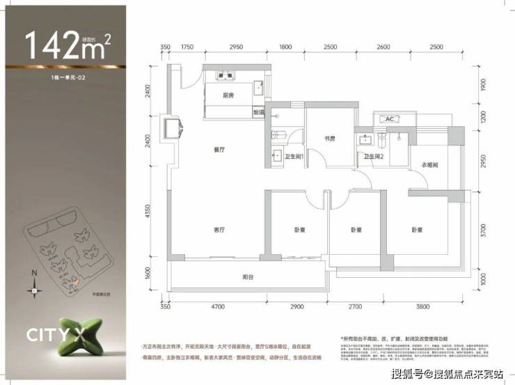 142㎡的4房2厅2卫,1栋1单元02户型,设计的是经典竖厅格局,进门入户玄关,客厅4.7米开间,LDKB一体化,S墙设计预留冰箱卡槽位,四开间朝南,动静分区,4个卧室分别做到了主卧24.03㎡/次卧9.99㎡/次卧8.99㎡/次卧7.6㎡(包含墙体飘窗),U型厨房,公卫三段式分离,得房率约75.4%(不含赠送),客厅连接次卧出12.16㎡的观景大阳台,东南朝向。套内面积107.06㎡+赠送面积14.75㎡=实得121.81㎡,加上赠送后得房率约85.78%。还未推售