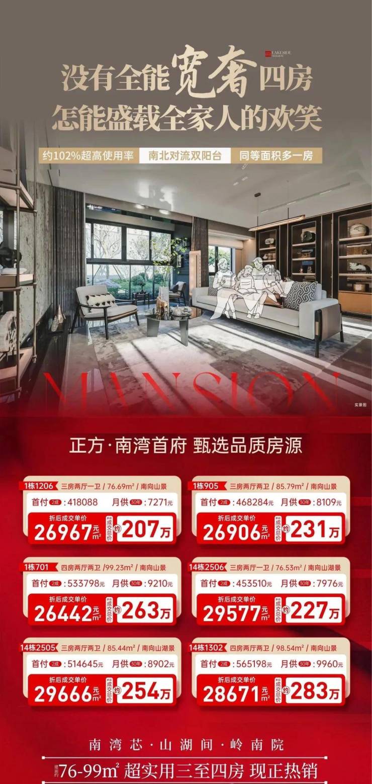 正方·南湾首府预计推出约180㎡涵山叠墅、约143-180㎡揽湖大平层、约76-98㎡凌云美宅。
