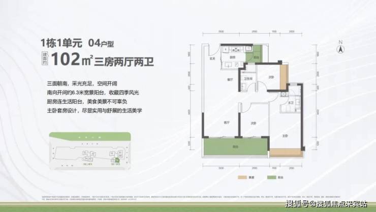 户型面积布局04102平三房两厅两卫设计的是经典竖厅格局,进门入户玄关,客厅3.5米开间,LDKB一体化设计,三开间朝南,动静分区,客厅连接次卧出6.3米长的巨幕大阳台,二字型厨房还带1个生活阳台,卫生间干湿分离,西南朝向。