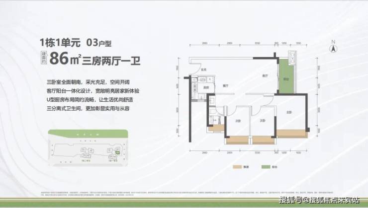 户型面积布局0386平三房两厅一卫设计的是竖厅格局,客厅3.5米开间,LDKB一体化设计,进深9.95米,主卧全朝南,动静分区,U型厨房,卫生间三段式分离,阳台1.5米进深,东南朝向。