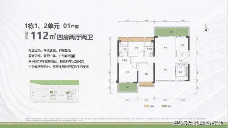 户型面积布局01112平四房两厅两卫设计的是竖厅南北通透格局,进门入户玄关,客厅3.6米开间,餐客分离,餐厨一体设计,四开间朝南,主卧套房带阳台,客厅连接次卧出5.8米长的巨幕大阳台,U型厨房,卫生间干湿分离,阳台主朝东北向看科学公园。