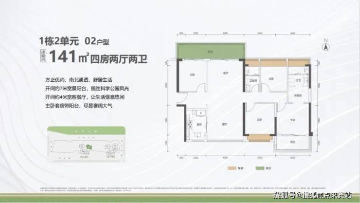 户型面积布局02141平四房两厅两卫设计的是竖厅南北通透格局,进门入户玄关,客厅4米开间,餐客分离,餐厨一体设计,四开间朝南,主卧套房带阳台,客厅连接次卧出7米长的巨幕大阳台,U型厨房,卫生间干湿分离,阳台主朝东北向看科学公园。