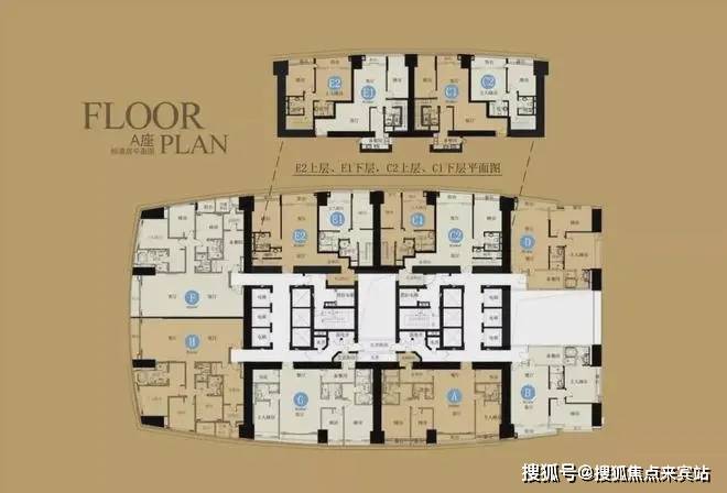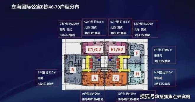 户型鉴赏:东海国际公寓建面约19万㎡,A、B两栋,户型涵盖75m²一房至800m²顶复,主力户型为140-500m²,户型面积跨度很大大,有30多个户型。
