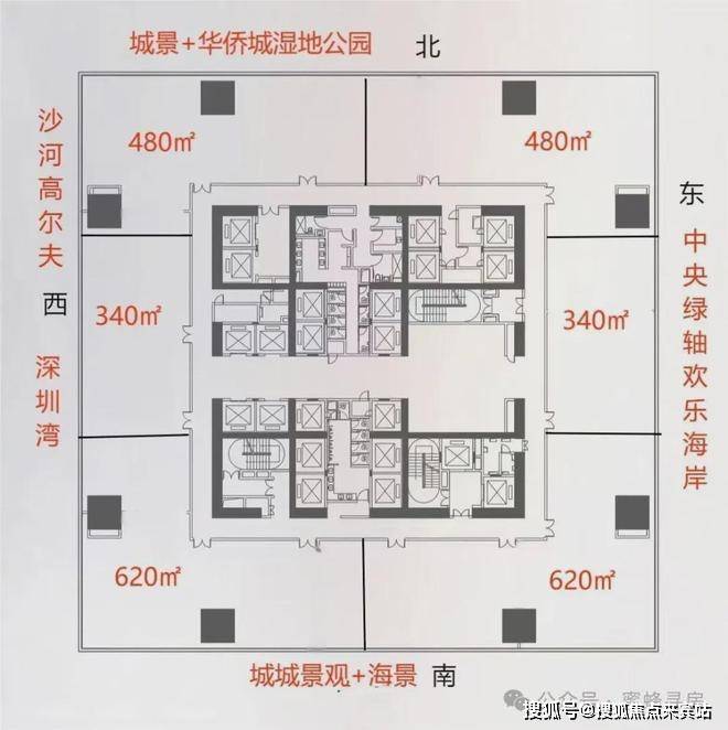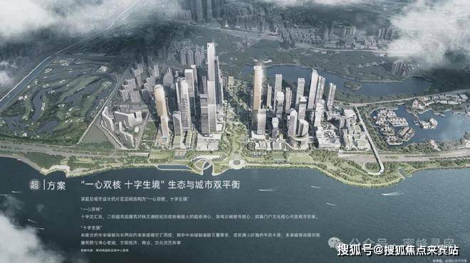 “一心双核”:十字交汇处,三栋高层建筑环绕交通枢纽形成势能强大的超级湾心;深湾云城都市核心、滨海门户文化核心代言城市形象。