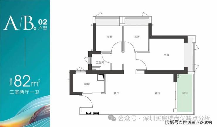 户型鉴赏【82-115m²】A/B座02户型-建面约82m² 三房两厅一卫
