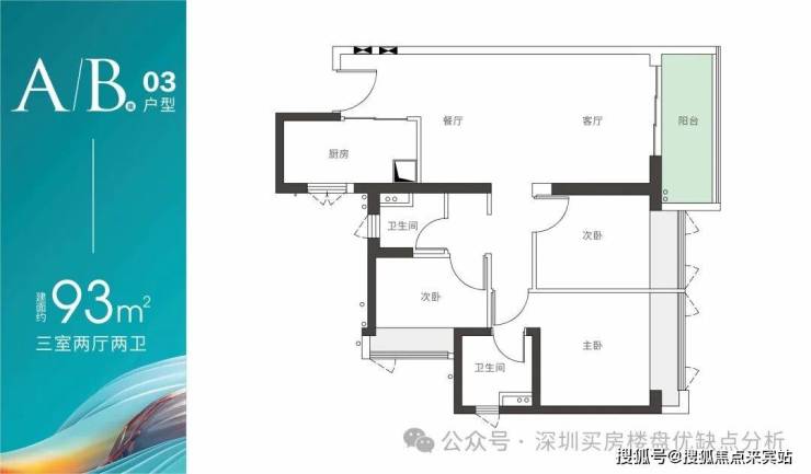 A/B座03户型—建面约93m² 三房两厅两卫