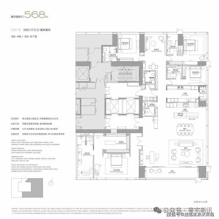 公寓主力户型为303㎡、326㎡、404㎡、572㎡等大平层,最大户型达1000㎡