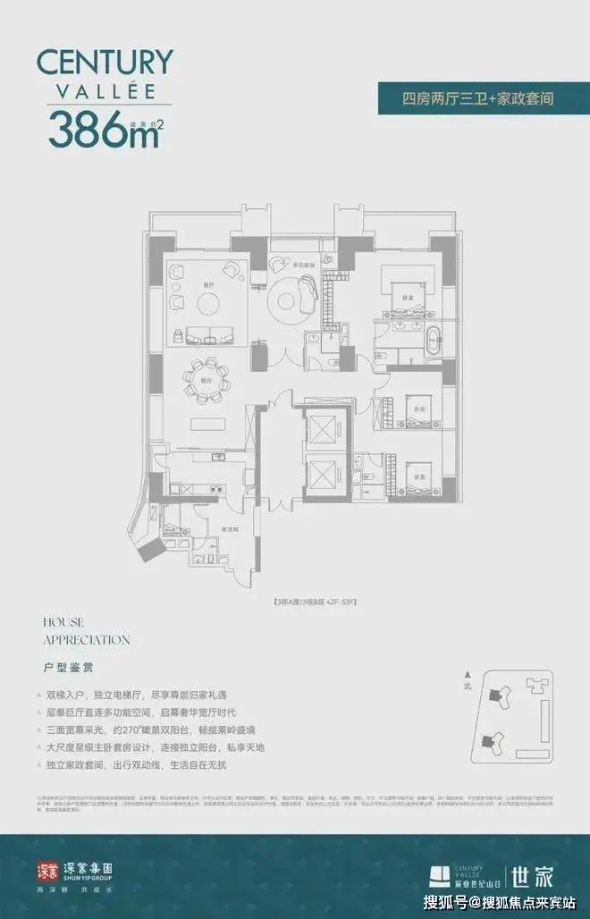 建面约386㎡户型,特色中西双厨,约17.2 米超大景观纵深,主卧标配与客厅同级别景观大阳台。世家“楼王”以超出想象的尺度,界定了居所的舒适度,更保证了圈层的纯粹性✨✨深业世纪山谷开发商电话:400-859-7606【☎☎开发商电话已认证】✨✽✽✽✽