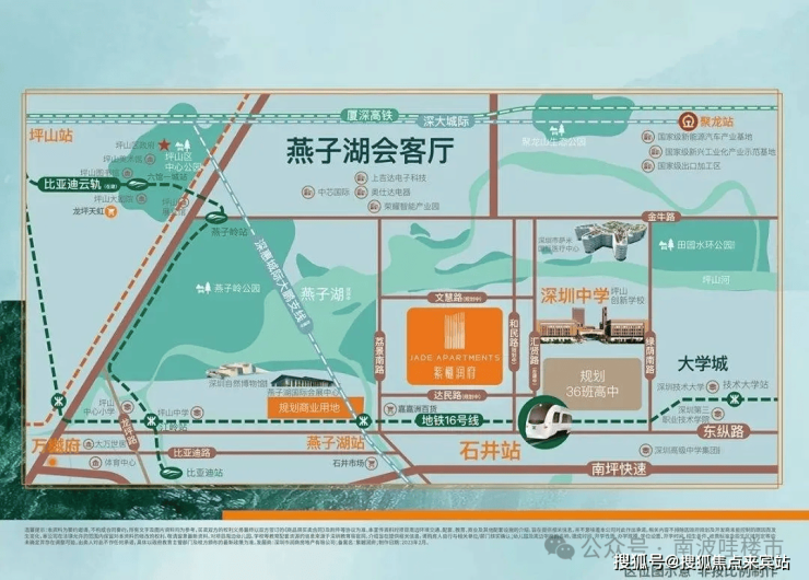 紫樾润府,位于坪山区石井街道东纵路旁,16号地铁线“石井站”D出口距离不到100米,项目所在片区属于燕子岭国际会展中心范围,项目东侧紧挨着同期在建的天健和悦府,北侧是新城燕澜和鸣, 西侧是卓越集团石井城市更新片区,磅礴热土日新月异,城市风貌引来质的飞跃。