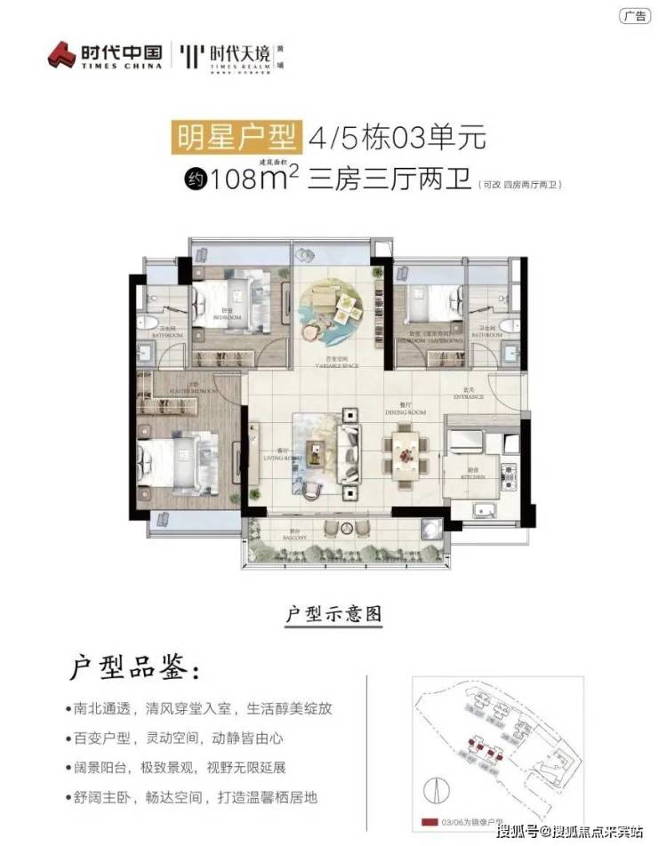 时代天境(黄埔)占地约4.5万㎡,总建面约18万㎡,由2栋高层、3栋超高层,共5栋楼组成,合计1140户,车位比1.2,产品面积户型为80㎡-108㎡三至四房,项目配套24班小学,背靠创新公园的山体资源。