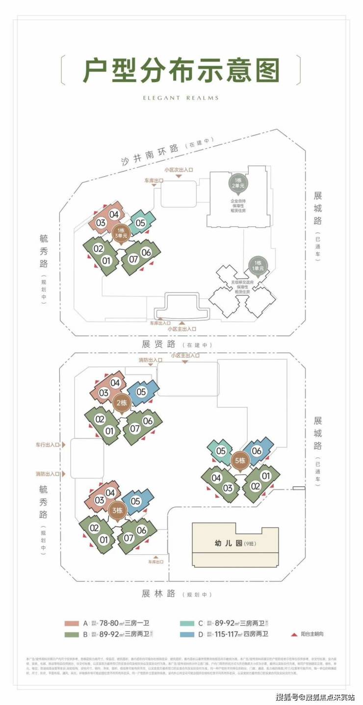 2、3、5栋为纯住宅,总高31-32层,4栋为1所4层2970㎡幼儿园,容积率4.3。