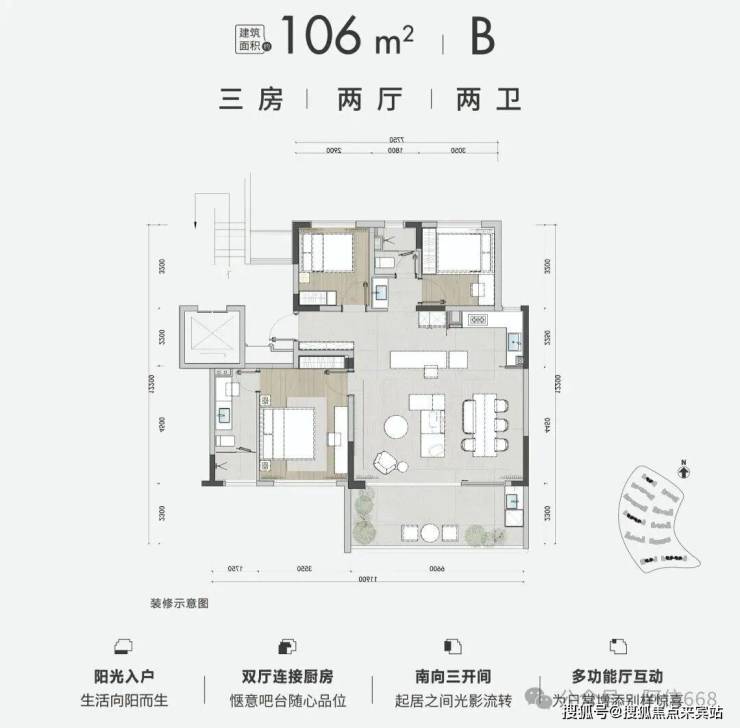 2、106平米三房两卫 B户型
