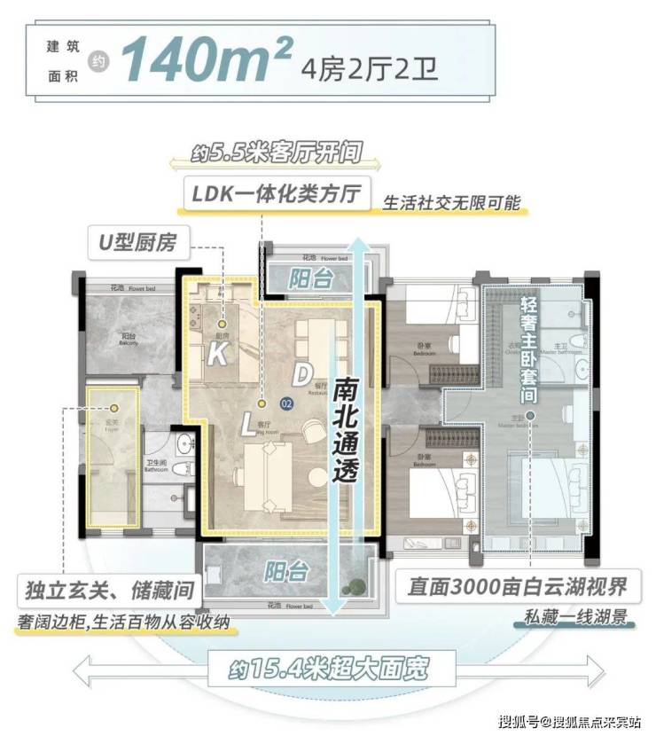 白云湖位于项目的东北角,首先,项目规划的楼栋全部采取一定角度的扭转38°,让湖景更好地分落到不同楼栋和不同户型上。同时,又采取北高南低的布局战略,确保东北面的湖景视野,同时又使得南北楼栋拥有多一小时的采光,通风也更加通畅。
