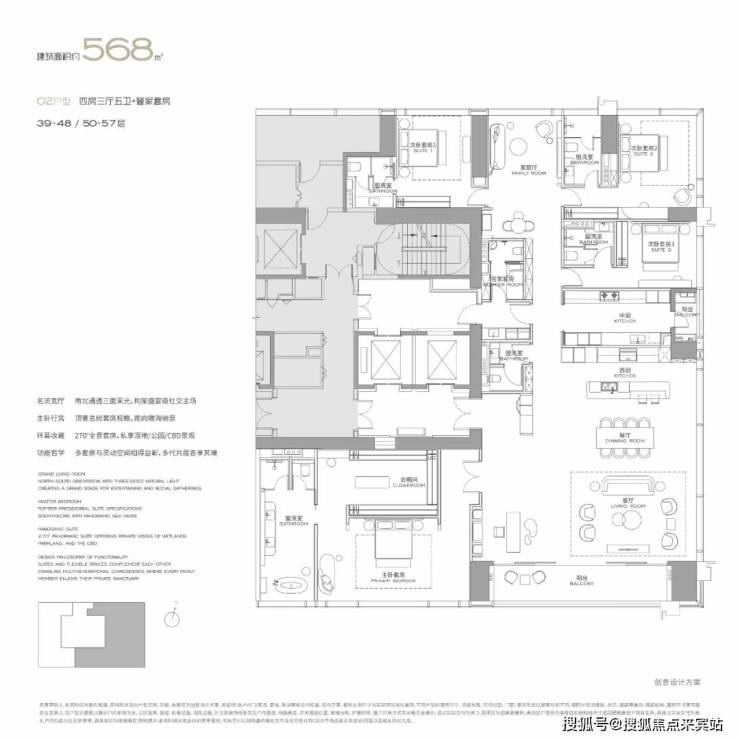 南北通透三面采光,顶奢总统套房规格,270°全景套房,享受湿地/公园/CBD景观,都是套房设计,更具私密性,中西厨分离。