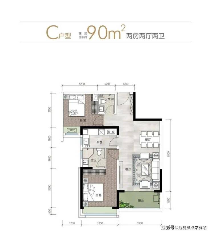 ●90㎡竖厅2房:LDKB一体化设计,客厅开间3.9米,主卧3.3米+飘窗,小家庭首选,得房率83.8%(含赠送)