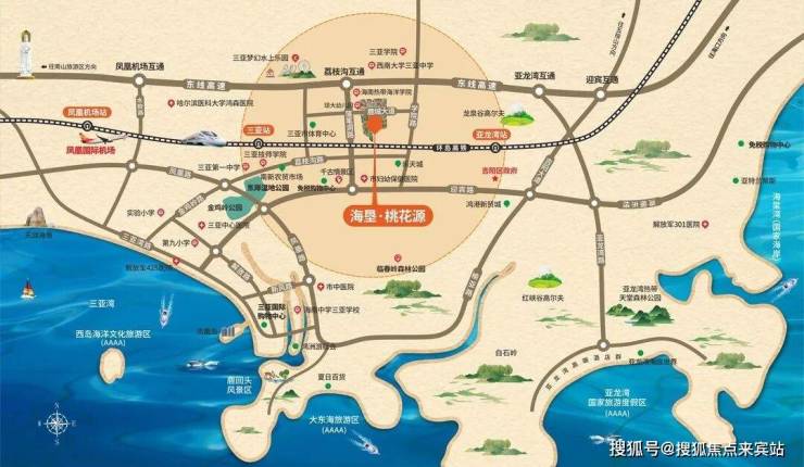 【交通配套】地处落笔洞路、鹿城大道主干道,毗邻环岛高速荔枝沟互通0.8公里。距离三亚动车站7公里,三亚凤凰机场17公里,多维立体交通,畅通全城。