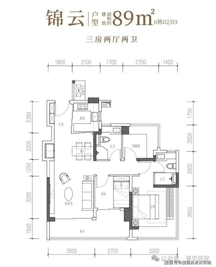 以LDKB无界场域盛放温情,以阳光长廊安放志趣,更以270°环幕主卧,升华为奢适的私密天地。• 锦云·建面约89㎡3房2厅2卫:南向阔厅,景致常驻,间间开阔,尺度舒适