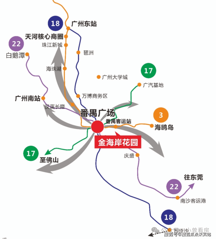 5轨交汇,雄踞双TOD枢纽中心尊处番禺客运站与番禺广场双TOD,五轨交汇(3号线/3号线东延线/18号线/22号线/17号线),一横五纵大动脉畅通四方。
