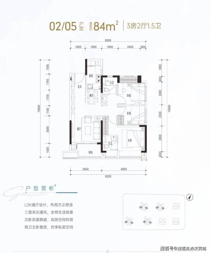 其中,推出建面约84㎡三房两厅两卫,约98㎡三房两厅两卫,约114㎡四房两厅两卫,约128㎡四房两厅两卫,共计4个面积段产品。