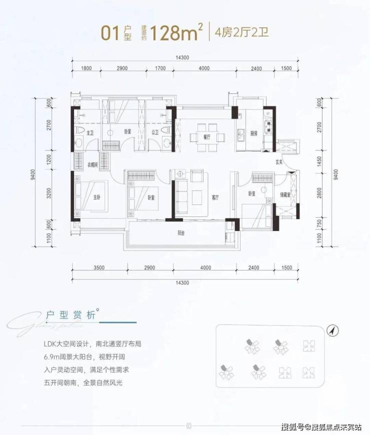 建面约128㎡属于南北通透竖厅格局,客厅进深7.1米(不含阳台),开间4米,配有6.96米宽景阳台,主卧套间设计,配有衣帽间和三段式卫生间。这个户型除通透性比传统横厅更优异外,静区部分的静溢性也会比较好,居住舒适性更佳,受众也是老少皆宜。