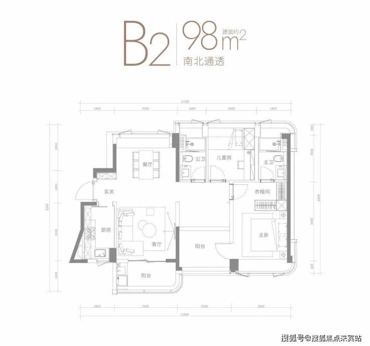 98㎡的3房2厅2卫,设计的横厅南北通透格局,进门入户玄关,客厅3.5米开间,四开间朝南,3个卧室分别是3.2米/3米/2.8米的宽度,L型厨房,得房率:75.91%(不含赠送),阳台主朝西南或东南向。
