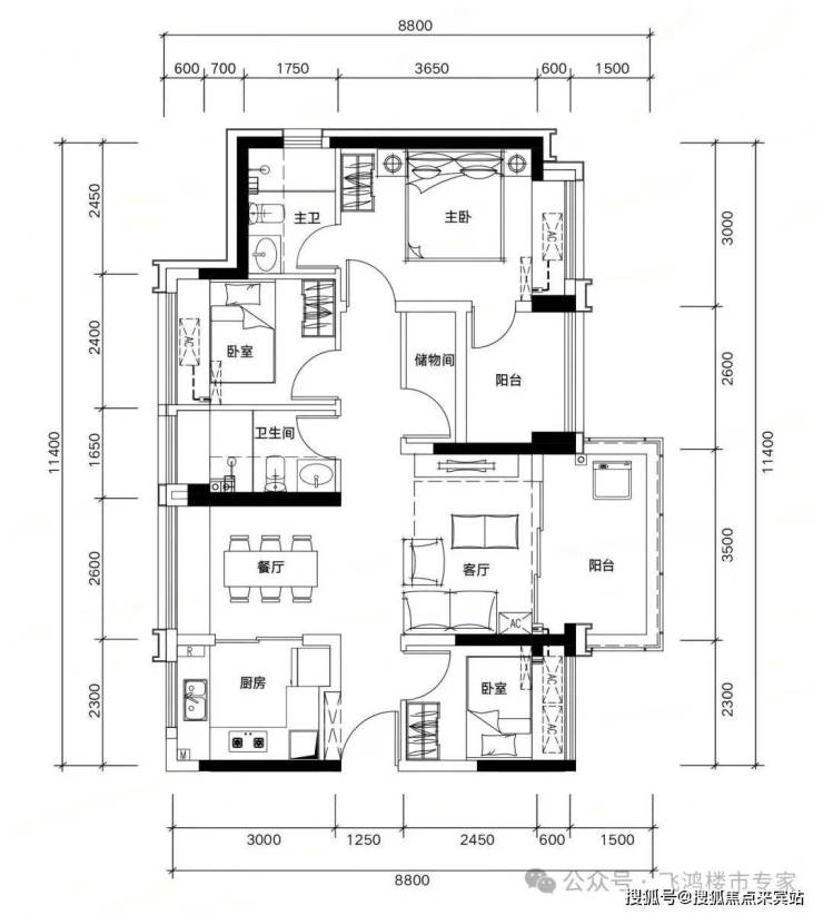 109㎡ 做成了舒适四房,得房率高达103.2㎡,南北通透双阳台设计